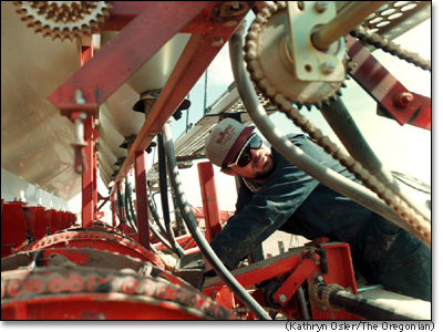 Hutterite farmer Albert Wollman pilots a potato planter through a Columbia Basin field. The spuds will be processed into french fries destined for fast-food outlets in Asia.
