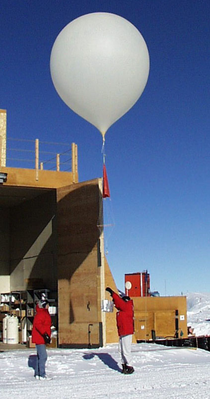 Elke Bergholz, left, watches as Joel Michalski, a NOAA scientist, prepares to release a weather balloon at the South Pole on January 17, 1999. The balloon is carrying an ozonesonde, which will measure the ozone in the air as it rises more than 80,000 feet. Bergholz was a teacher at the United Nations International School in New York City who was working at NOAA South Pole Lab as part of the Teachers Experiencing Antarctica Program. Her Web journal from that day is still available online.