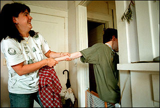 He threads his way toward the kitchen, where his mother bends
