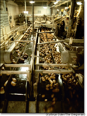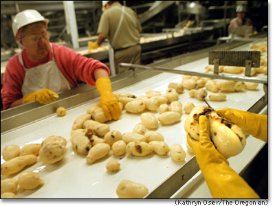 Workers at the J. R. Simplot Co. plant in Hermiston cut blemishes from washed potatoes. The plant, which employs 650 people, is one of many Northwest plants targeting Asian markets.