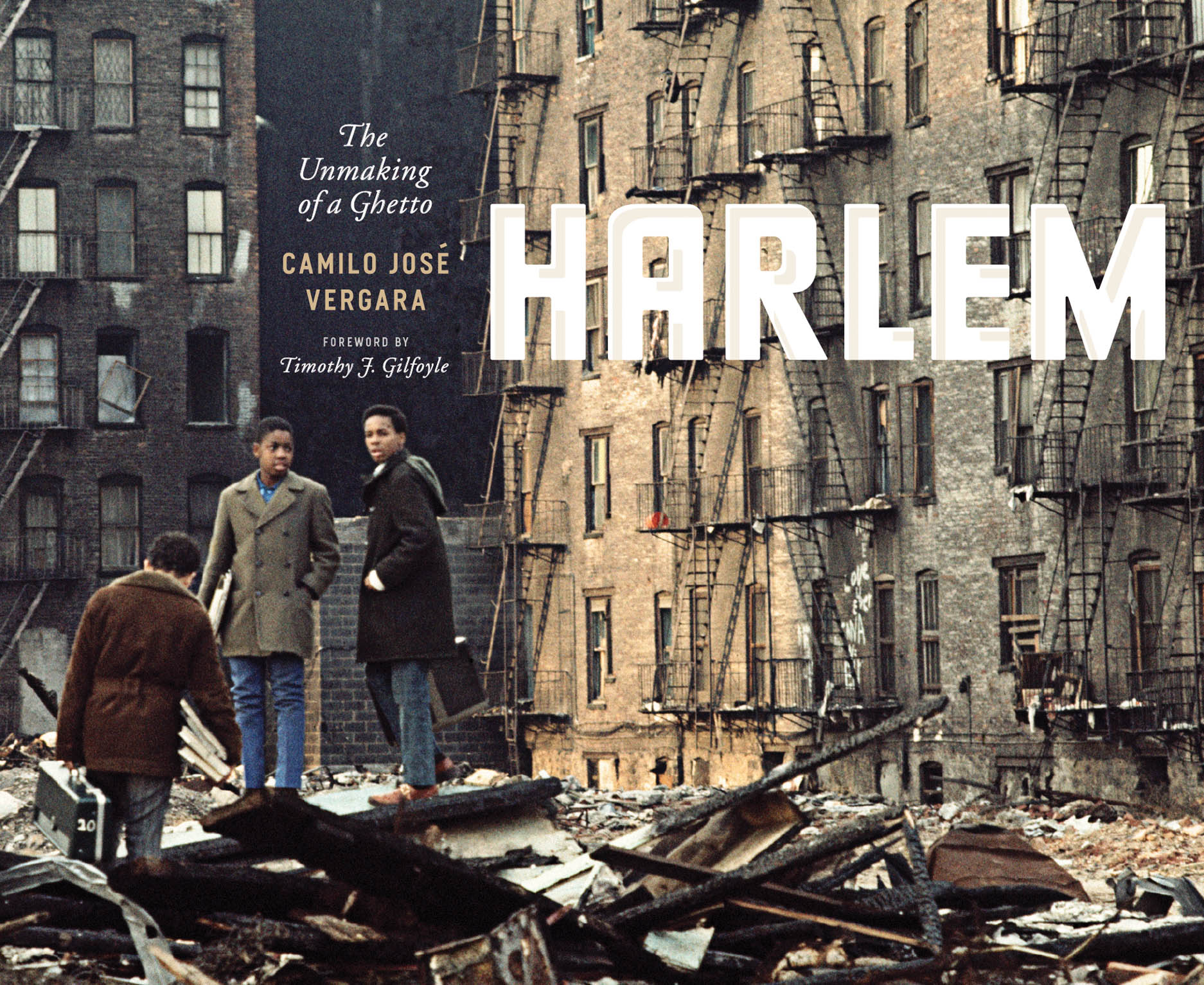 Photographer Camilo José Vergara has been chronicling the neighborhood for forty-three years, and Harlem: The Unmaking of a Ghetto is an unprecedented record of urban change. Vergara began his documentation of Harlem in the tradition of such masters as Helen Levitt and Aaron Siskind, and he later turned his focus on the neighborhood’s urban fabric, both the buildings that compose it and the life and culture embedded in them. By repeatedly returning to the same locations over the course of decades, Vergara is able to show us a community that is constantly changing—some areas declining, as longtime businesses give way to empty storefronts, graffiti, and garbage, while other areas gentrify, with corporate chain stores coming in to compete with the mom-and-pops. He also captures the ever-present street life of this densely populated neighborhood, from stoop gatherings to graffiti murals memorializing dead rappers to impersonators honoring Michael Jackson in front of the Apollo, as well as the growth of tourism and racial integration.