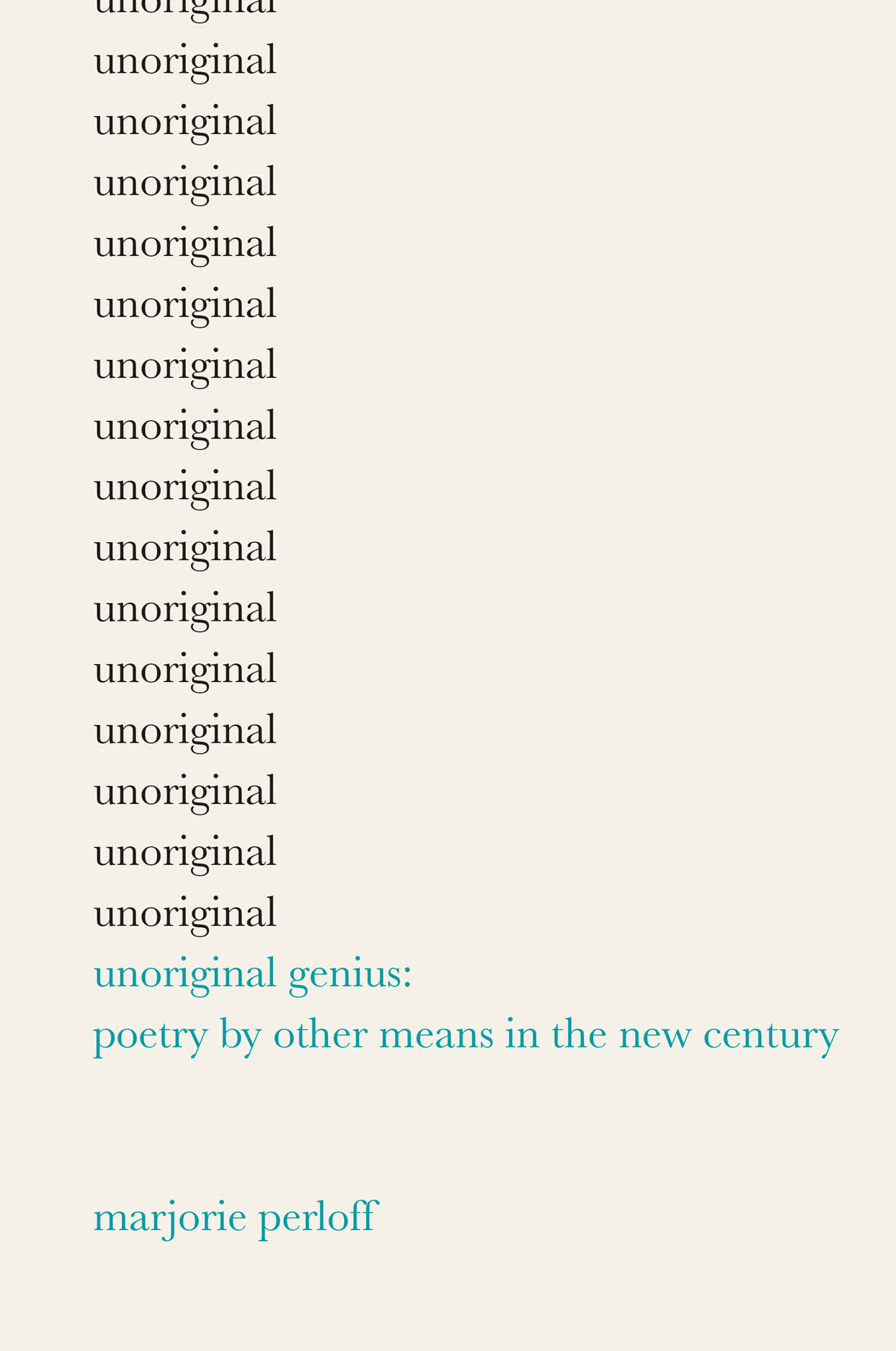 “In this book Marjorie Perloff launches the study of poetry into the era of streaming video, blogging, text messaging, Internet search engines, and social network sites. She recounts the many creative techniques—from elegant theft to multilingual multichannel noise—that authors have employed while exploring twenty-first-century technologies for storing, generating, and distributing the written and spoken word. She also provides a backstory for this exciting new phase in world literature that includes Walter Benjamin’s Arcades Project and Brazilian concrete poetry. Unoriginal Genius is news that will stay news.”